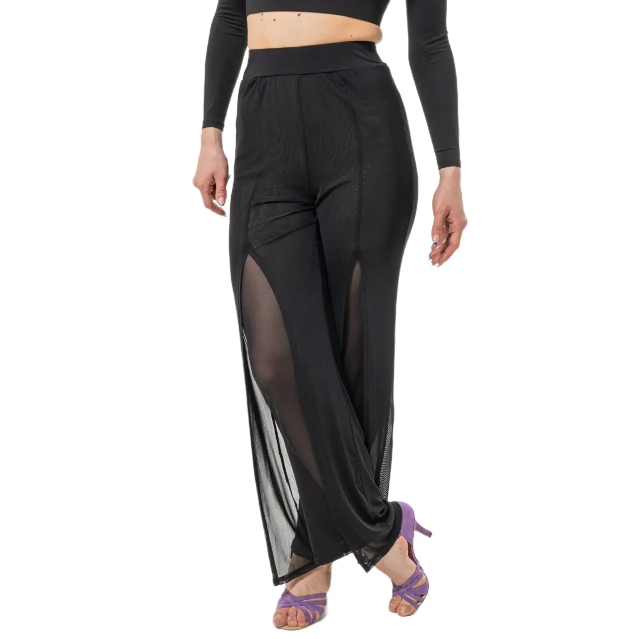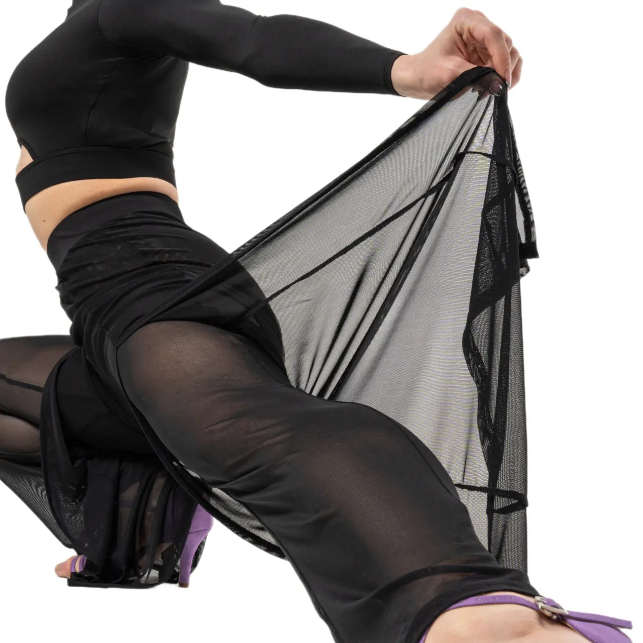 Die Hose ist aus feinem Netzstoff gefertigt, der leicht, atmungsaktiv ist und bei Bewegung wunderschön fließt. Doppellagige Materialpartien in Kombination mit langen Schlitzen erzeugen einen effektvollen, dynamischen Look – bei jedem Schritt entfaltet sich der Stoff elegant und betont die Beinlinie.