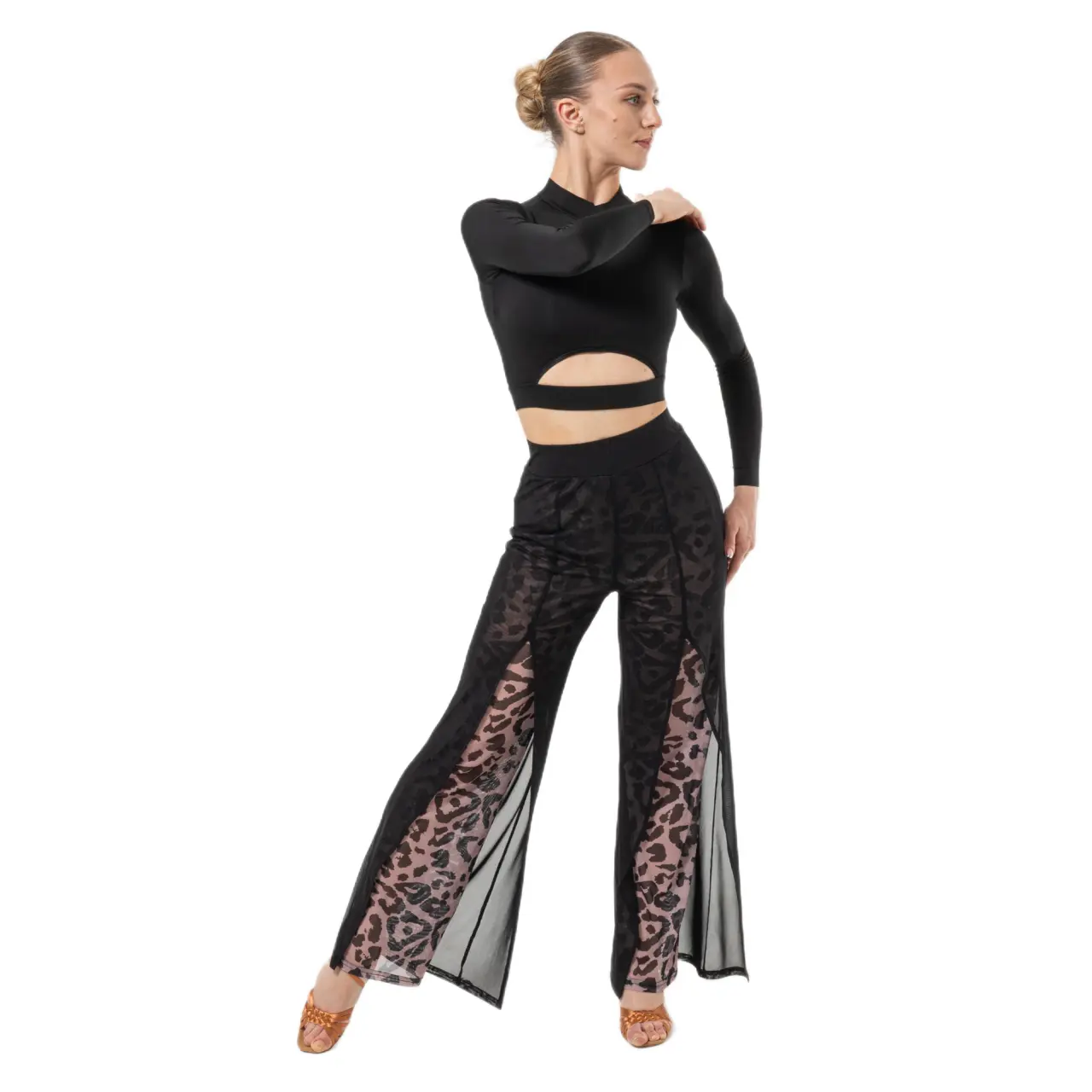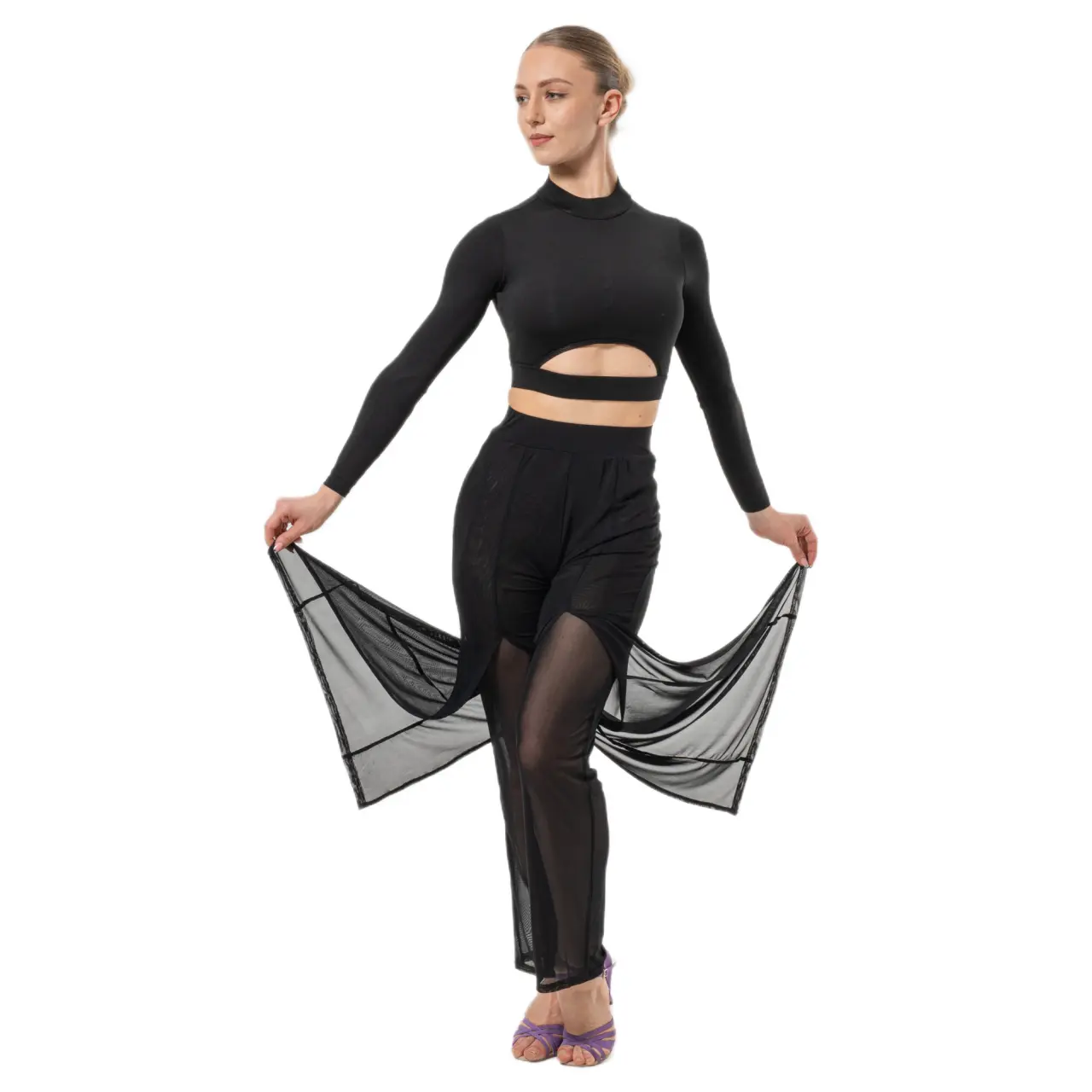 Transparente Einsätze verleihen dem Modell Sinnlichkeit und visuelle Leichtigkeit, während der körpernahe Schnitt im Bereich von Taille und Hüfte die Figur schön formt, ohne die Bewegungsfreiheit einzuschränken. Der flache Gummibund sorgt für angenehmen Tragekomfort und sicheren Halt während des gesamten Tanzes.