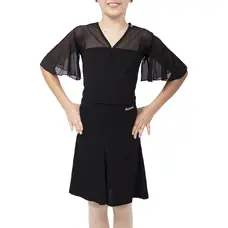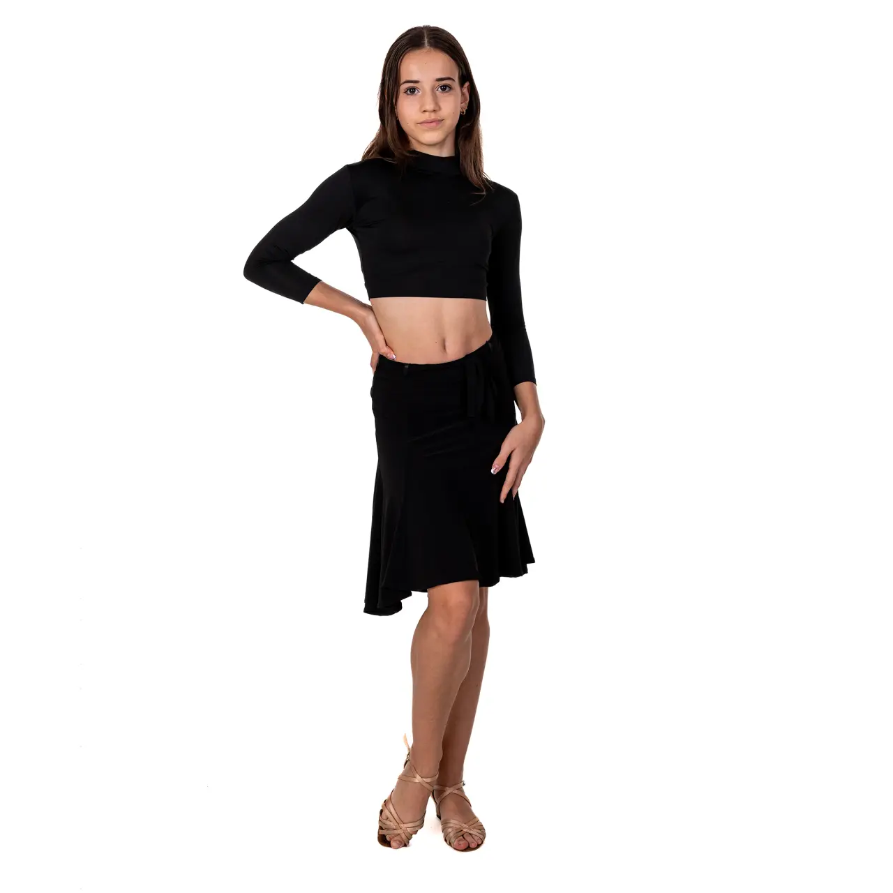 Ein raffiniert geschnittener, unten breiter, fünfteiliger Rock. Der flache, ca. 3 cm breite Bund verfügt über Satinschlaufen. Der Gürtel ist aus demselben Material gefertigt, wie der Rock selbst. Vorne etwas kürzer, daher ist die Arbeit der Knie gut sichtbar. Material: Polyamid, Elasthan/ Spandex.