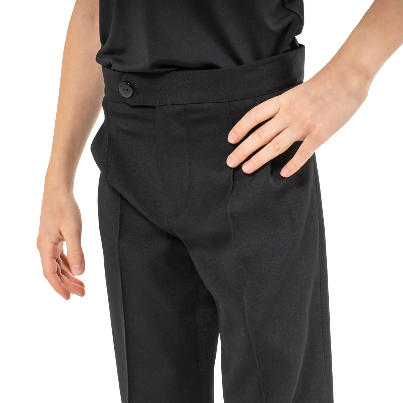 Diese Basic-Jungenhosen aus fließendem Material gehören zu den Essentials der Tanzbekleidung für Jungen. Der feste, glatte Taillenbund mit Knopfverschluss und jeweils einer eleganten Falte an der Vorderseite verleiht der Hose ein stilvolles Aussehen. Die Hosenbeine sind länger und können auf die gewünschte Länge umgeschlagen werden. Dank ihres schlichten Designs eignet sich die Hose auch für Wettbewerbe in jüngeren Alterskategorien und Tanzklassen.