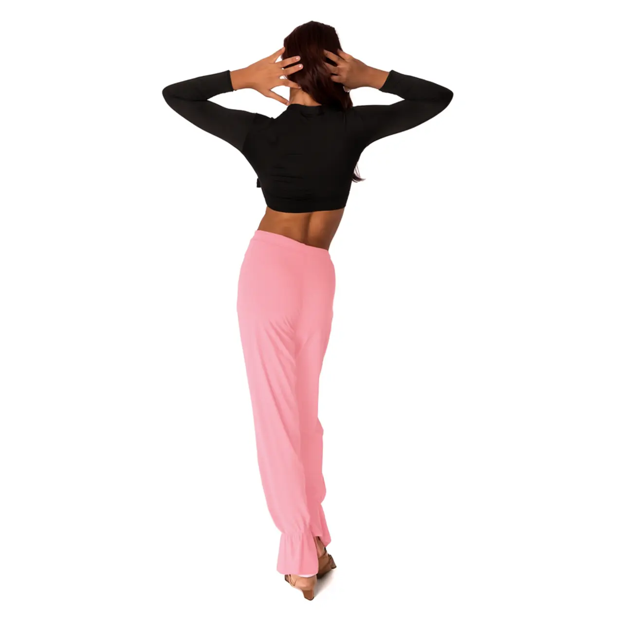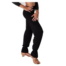 Die Hose hat einen geraden, glatten Schnitt, liegt schön an den Hüften an und sitzt dank des flachen Gummibunds bequem, ohne einzuschneiden. Die leichte Raffung an den Knöcheln verleiht der Hose einen modernen und zugleich praktischen Look – sie behält beim Tanzen ihre Form und wirkt nicht störend.