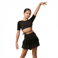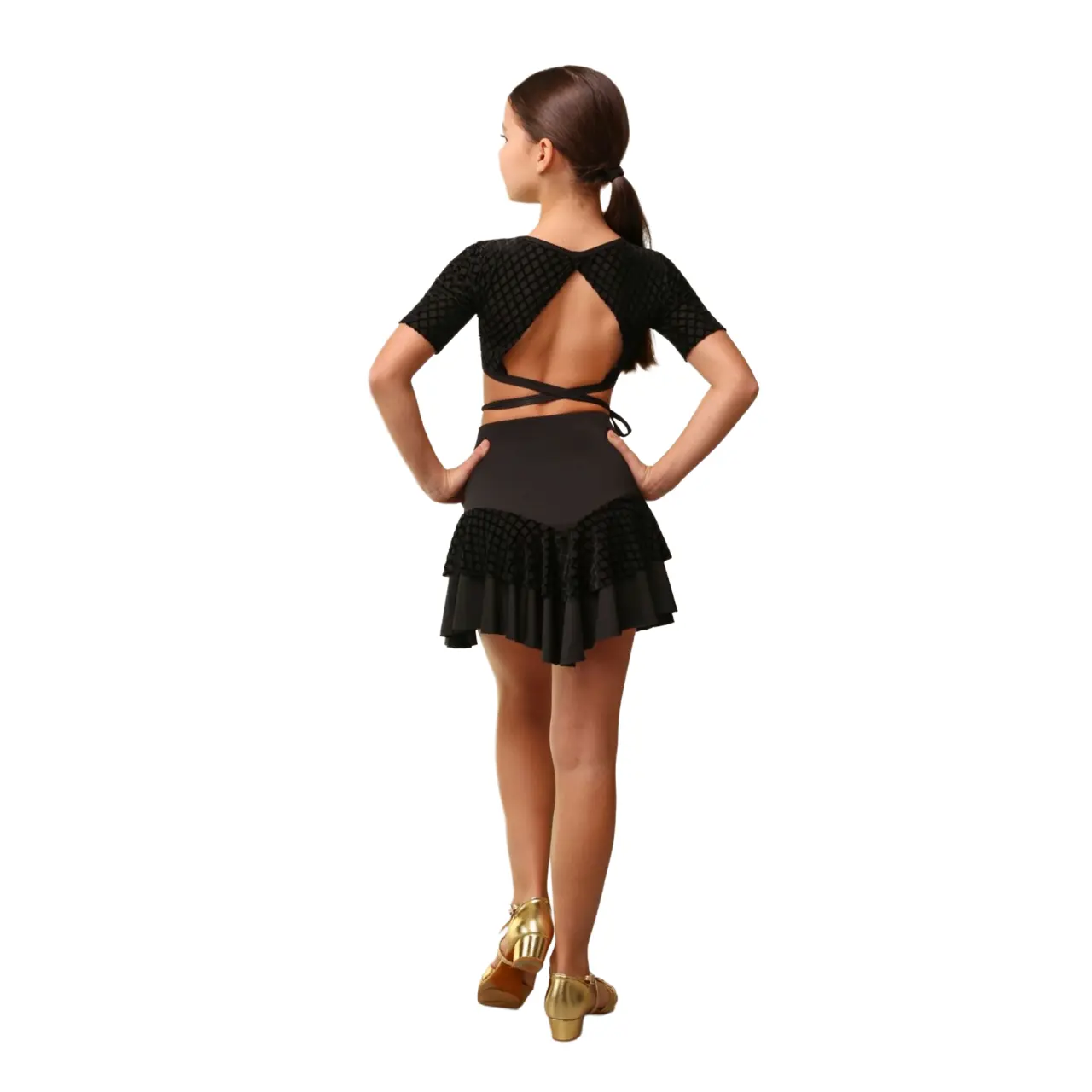 Das Mädchen-Tanztop Iona aus der MINI NOIR Kollektion besticht durch ein elegantes Design, das für lateinamerikanische Tänze konzipiert ist. Der markante offene Rücken in Kombination mit der verstellbaren Bindung ermöglicht eine individuelle Anpassung und sorgt gleichzeitig dafür, dass das Top während der Bewegung zuverlässig an seinem Platz bleibt.