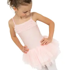 Ein super süßes Tanztrikot mit Tutu-Rock und dünnen Spaghettiträgern. Das Trikot hat feine, saubere Linien. Den Ausschnitt zieren vorne kleine glänzende Strasssteine. Das Mesh-Gewebe auf der Rückseite rundet den angenehmen Look ab. Der Rock ist dreilagig.