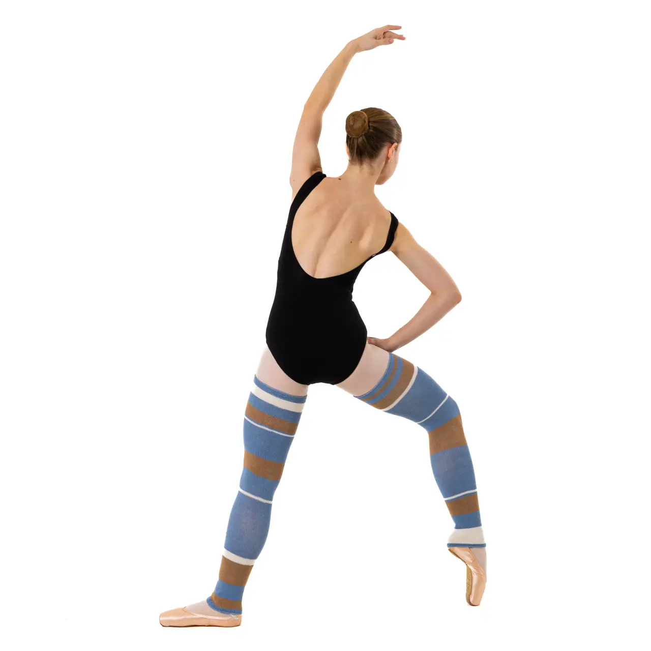 Diese gestreiften Stulpen bestehen aus Bambusfasern, die weich, atmungsaktiv und komfortabel sind. Die Pastellfarben in Blau-, Elfenbein- und Hellbrauntönen passen zu einer Vielzahl von Outfits, und das Streifendesign ist zeitlos. Die Länge beträgt im ungedehnten Zustand etwa 65 cm.
