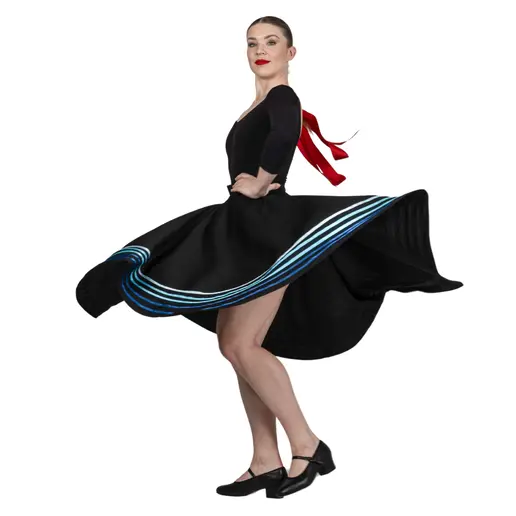 Knielanger Charaktertanzrock aus Polyester, geeignet fürs Volkstanztraining. Der Rock hat elastischen Bund, den unteren Teil zieren 5 bunte Kontraststreifen. In schwarzen Farbe erhältlich, mit unterschiedlichen Streifenfarben.